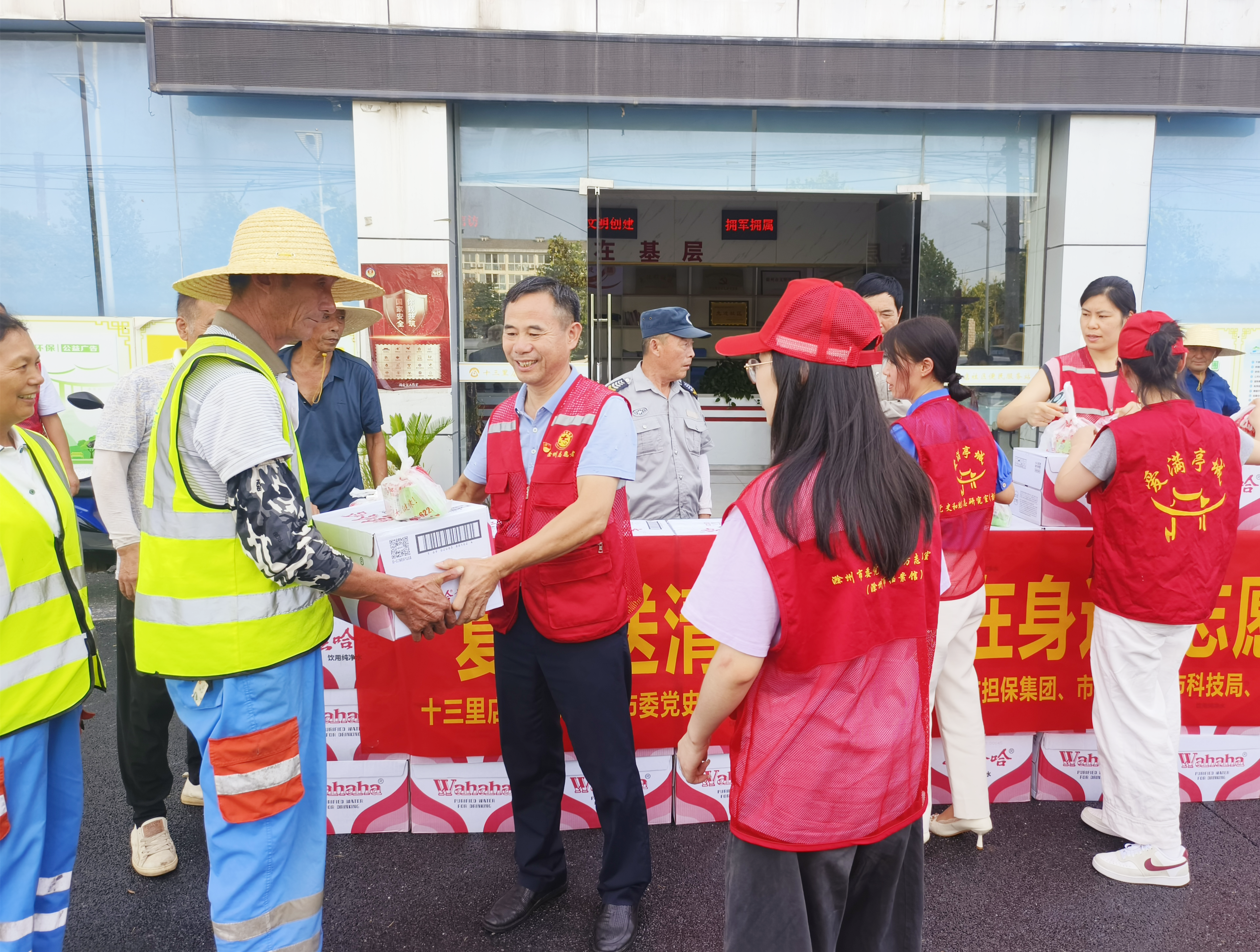2024年8月12日,集團(tuán)黨支部和普惠擔(dān)保公司黨支部的黨員志愿者們來到十三里店社區(qū)黨群服務(wù)中心,與包保社區(qū)的其他黨員志愿者一起,將精心準(zhǔn)備的礦泉水、香皂、風(fēng)油精、花露水等防暑降溫物品一一分送到社區(qū)每一名環(huán)衛(wèi)工人手中,并叮囑環(huán)衛(wèi)工人們高溫作業(yè)要注意防暑降溫,加強(qiáng)自我防護(hù),確保自身安全。