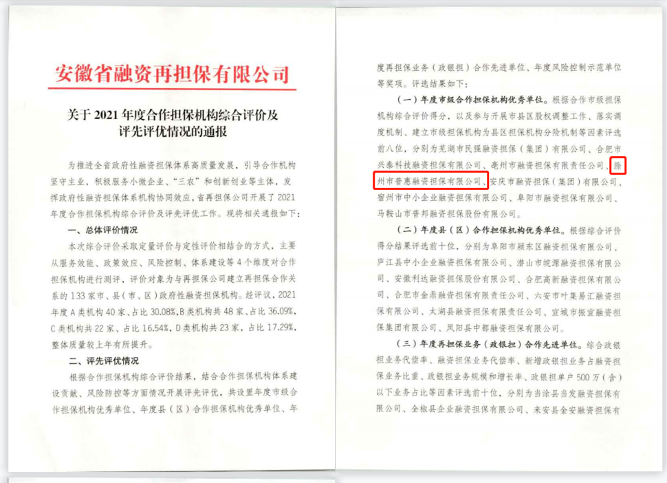 市普惠擔保公司榮獲安徽省2021年度市級合作擔保機構(gòu)優(yōu)秀單位